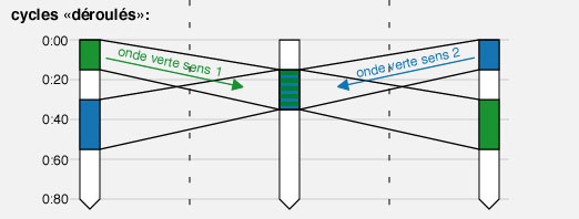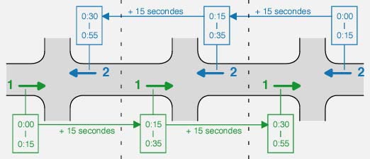 Tous les carrefours intégrés dans l'onde verte fonctionnent selon des programmes cycliques, fixes ou conditionnels. La durée d'un cycle doit être exactement la même sur chaque carrefour. Tous les carrefours «tournent» alors de manière indépendante, mais à la même vitesse, et l'onde verte n'est plus qu'une question d'ajustement: à chaque carrefour, les phases vertes de l'axe principal doivent être programmées avec un décalage adéquat par rapport au carrefour précédent (5, 10, 15, 20 secondes, selon la distance). On prévoit si possible, entre le premier et le dernier carrefour, un allongement de la durée des phases vertes, pour tenir compte de «l'effet d'accordéon» ou du trafic supplémentaire débouchant des axes secondaires.