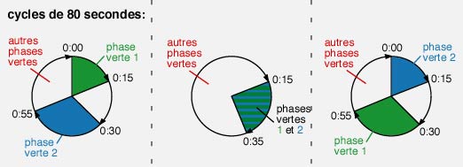 Un programme acyclique, qui réagit au trafic à la seconde près, ne peut offrir une telle prévision, sur 10 ou 15 secondes par rapport au carrefour précédent, que dans des cas relativement simples . Cela suppose en effet que le carrefour suivant soit «prévenu» de l'arrivée des véhicules (liaison par câble ou par ondes entre les armoires de commandes), et qu'il «s'organise» alors en conséquence. Lorsque les carrefours sont complexes ou nombreux, on recourt plus volontiers à des programmes cycliques, dont le fonctionnement régulier permet la «prévision» souhaitée.